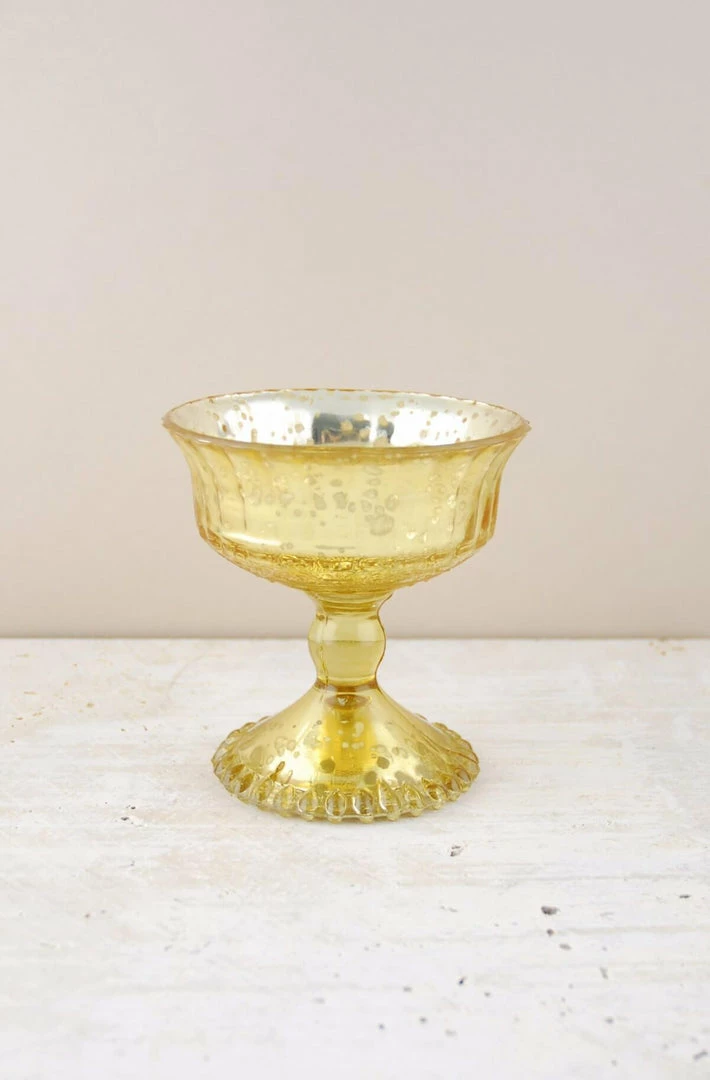 Display small graceful floral arrangements with this petite Mercury Glass Compote in Gold! This glass chalice features a gold mercury glass style coating with silver interior which gives it a dappled metallic appearance. With its slightly scalloped top and charming hobnail design at the base, this darling compote is an excellent choice for accentuating vintage décor. For use with fresh florals, we recommend using floral foam or a pin frog (not included). Perfect for weddings, special events, and dinner parties! Â