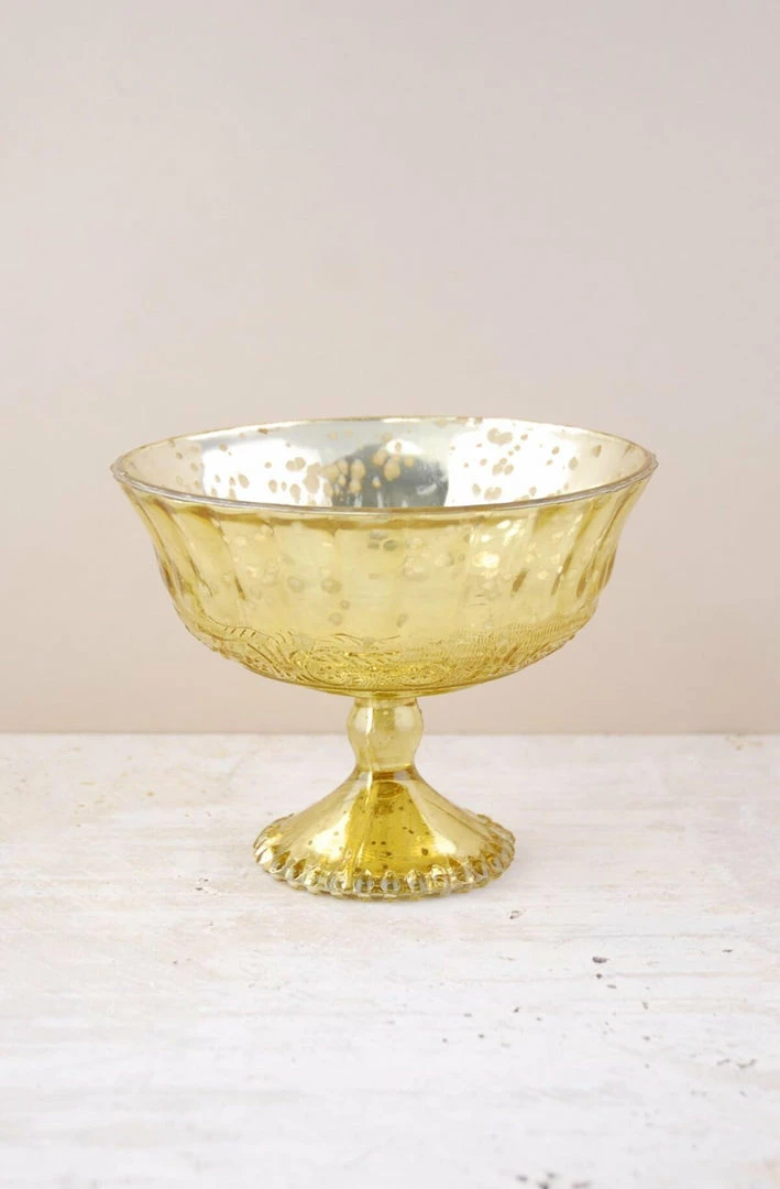 Showcase your floral arrangements in this striking Mercury Glass Compote! The gold mercury style finish compote with silver interior features a slightly scalloped top and beaded detail around the base, just under 7″ wide and 5.25″ tall. This elegant glass compote is coated on the inside with metallic paint to give it a speckled appearance that is perfect for accentuating vintage decor and glamorous events. Perfect for weddings, special events, and dinner parties! Â