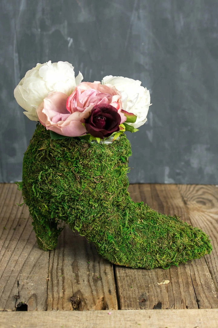 This moss covered shoe is also a planter for flowers. It is covered in dyed and preserved moss and has a plastic liner. Measures 7″ tall x 2.75″ wide and is 9″ long.
