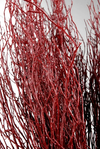 Bring rustic beauty to your decor with these Red Huckleberry Branches. Each bundle contains approximately 26-36 Natural Branches. They measure 19in – 22in tall. Full, 8 ounce bundle. The red painted Sweet Huck branches have thin tendrils and shine; making them a great addition to floral arrangements or wreaths. The full size of the bundle and shine also allows them to be used alone within a vase or bucket for a lovely accent.