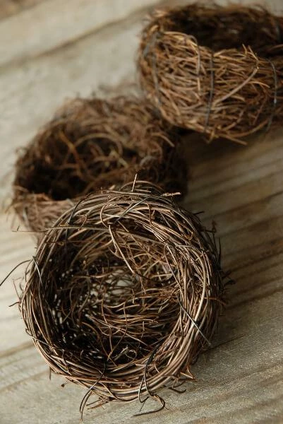 This pack of 9 handmade Bird Nests are spun from dried vines. Use these nests as containers for candies or to add to your centerpieces and wreaths. These nests come in sets of 9, and each measure 3 wide.