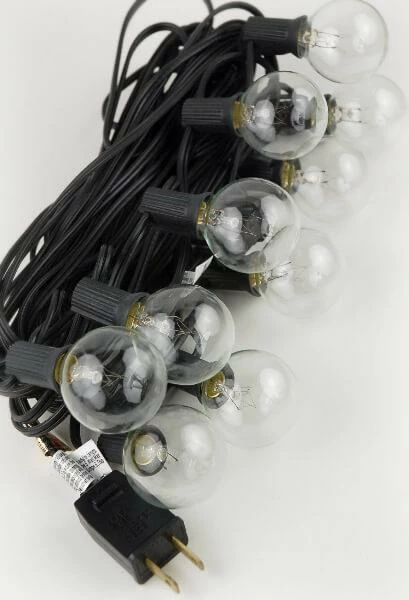 10 SOCKET OUTDOOR PATIO STRING LIGHT SET, G40 CLEAR GLOBE BULBS, 31 FT BLACK CORD W/ E12 C7 BASE Perfect to use to light Paper Lanterns also. Use for 12′ -24′ lanterns. Has 10 Clear G40 Bulbs 10 Sockets (36′ spacing) Black Cord (31.5′). Each socket has a 36′ inch spacing between bulbs with a 2′ lead cord on each end. Each C7 socket comes with a 5 watt clear bulb, each bulb is 1.5′ wide. Can be used for indoors or dry outdoor use, connect up to 3 sets of these lights together. Comes with end-to-end. UL Listed plugs.