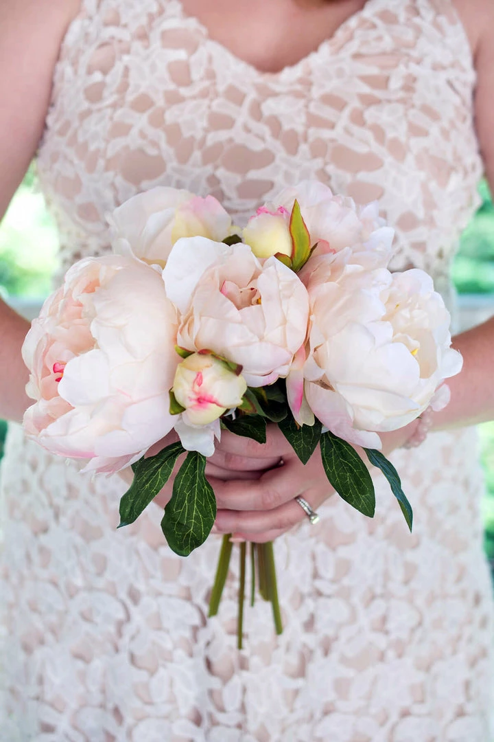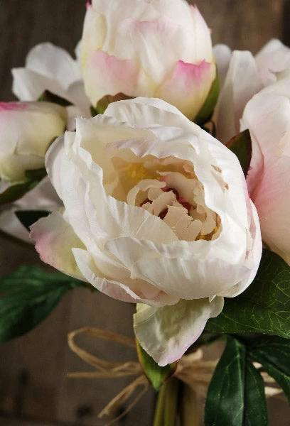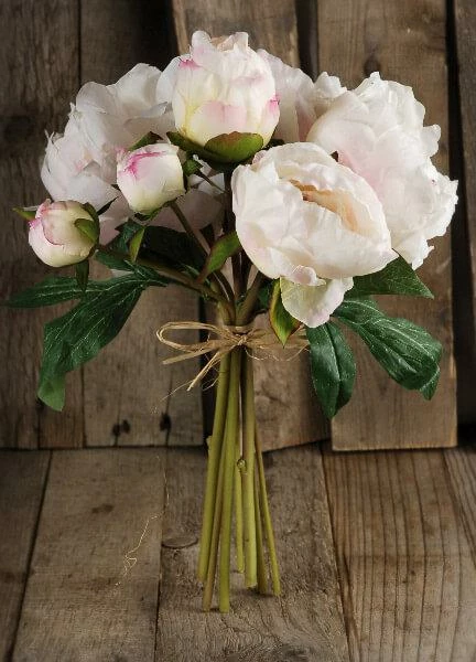 This is a 14 inch tall bouquet, perfect size for bridesmaids. The Silk Peony Bouquet in Cream adds a delicate, rustic touch to your county wedding. With its life-like appearance and cerise accents, this bouquet can be used as the bridal bouquet, or in a simple centerpiece. This bundle of blooms is tied with raffia, stands 14in tall x 8in wide. The flower heads range from 1.5in to 5in wide, and the stems measure 7in long.