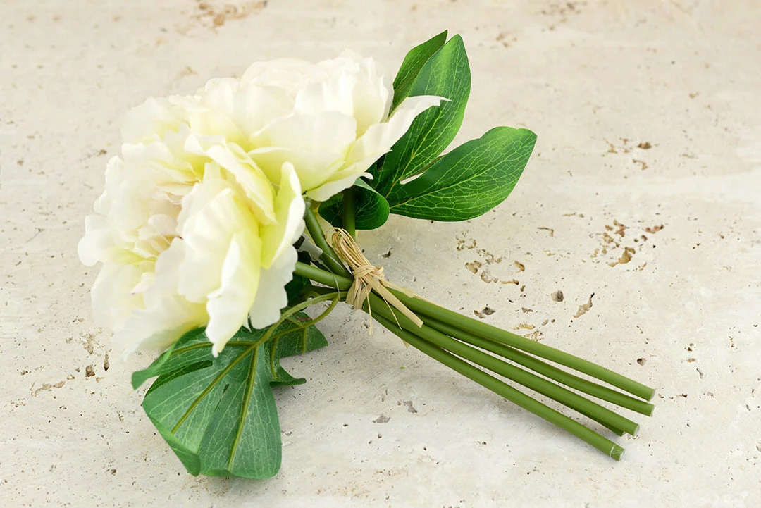 Stunning white silk Peony wedding flowers. This beautiful white peony silk flower bouquet is hand wrapped and stands 10″ x 10″ wide. Perfect as is for a classic bridesmaid bouquet, or combine with another bouquet to make a centerpiece, aisle decoration or more. The peony buds are 2.5″ wide and the open flowers are 6″ wide. Made with quality poly/silks with wired stems.