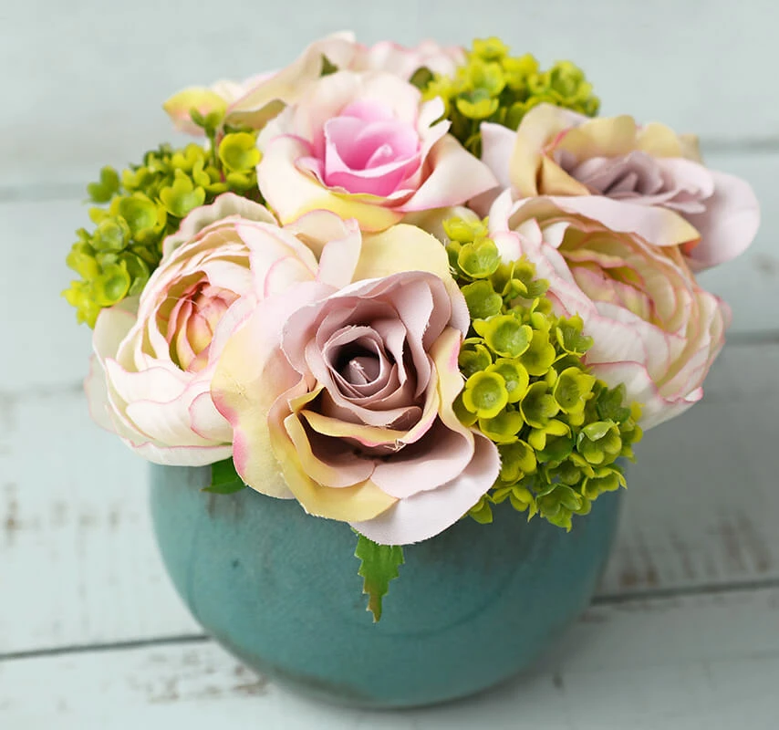 This silk Rose & Hydrangea Arrangement is set in a aqua crackled ceramic vase. It has added plastic greenery detail. The faux flowers are inserted into a styrofoam base that is topped with moss for a realistic feel. This ready-to-use display can be placed on coffee tables, bookshelves, console tables, decks and patios, or even used as a quick centerpiece for an event.Â