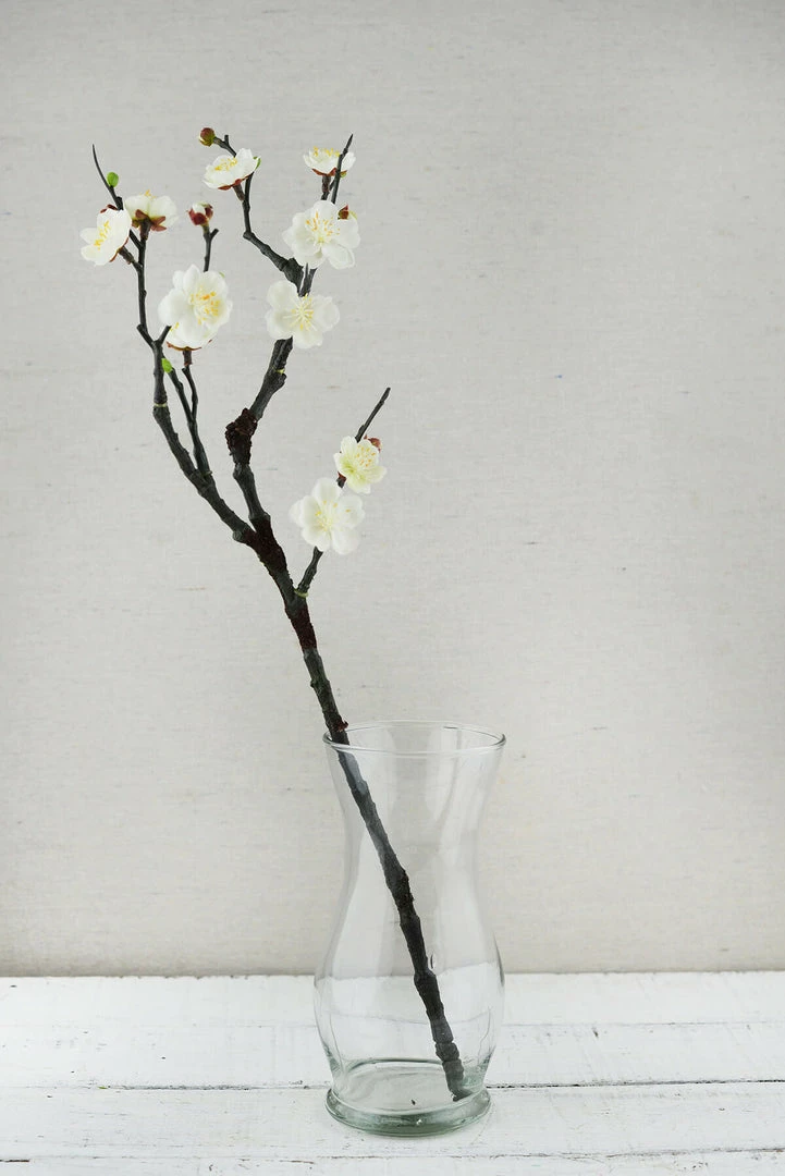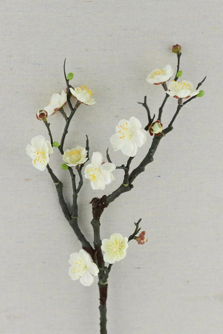 Add traditional beauty to your home or venue with the Plum Blossom Spray. The blossoming branch is dark brown with hints of green and holds cream colored blossoms that measure 1″ to 1.25″ wide. It is 18″ tall with silk blossoms. The stem is wired.