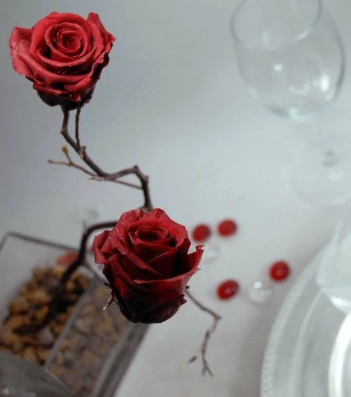 Bring regal detail to your decorations with these rich blooms. The Burgundy Preserved Rose Heads will bring a velvety look to your romantic wedding ceremony or romantic dinner. For a lush arrangement, arrange these buds on the tiers of your white wedding cake. These flowers and 1in wide, 1in tall, and have been preserved in a glycerin solution, and will stay vibrant and fresh looking for years.