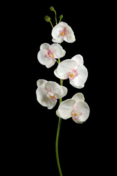 Mimicking the exotic beauty of a live orchid plant this Real Touch White Phalaenopsis Orchid stem is 38″ tall with 5 flowers. Each flower is 3-4″ wide. It has a natural look and feel, and can be displayed year-round without fading. They are the very best in artificial flowers. They are water proof, fade resistant, and crush proof. They will maintain their color, texture, and beauty forever.