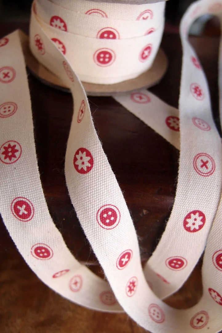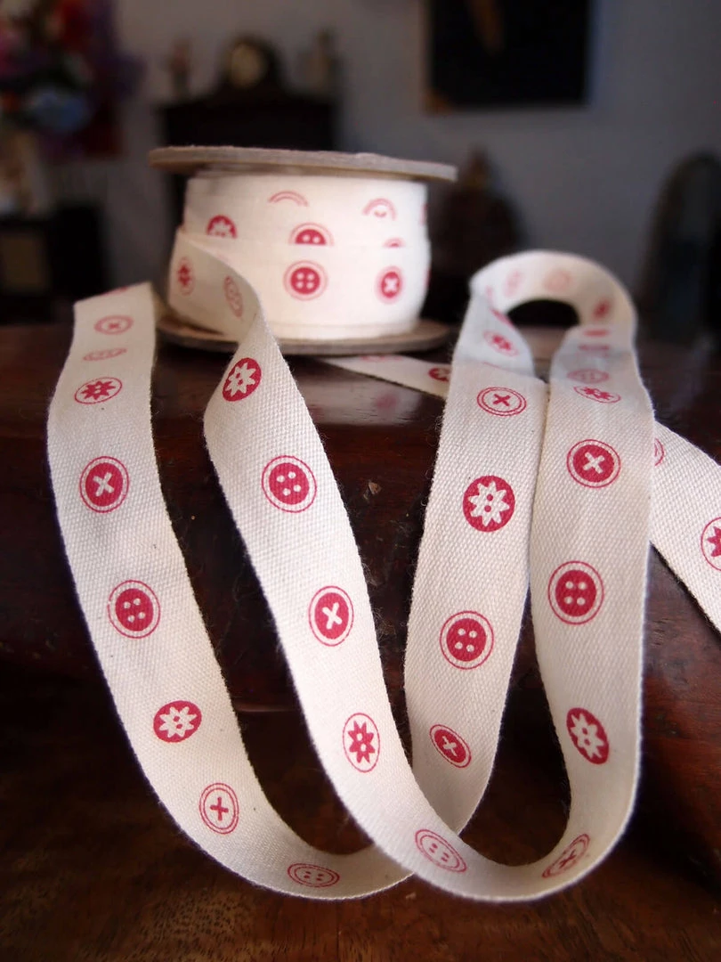 Red and ivory cotton printed ribbon with buttons. Unwired and 100% cotton. Printed on one side. This cotton ribbon measures 5/8 inch wide. Unique gift ribbon.