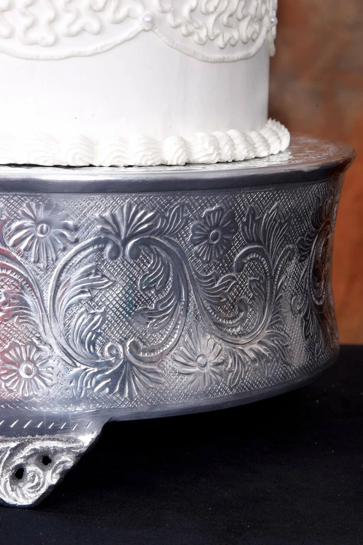 This is one cake stand you will want to keep on display long after the cake is eaten! The Aluminum Cake Stand measures 14″ wide and features floral scrollwork around the outside of the plate as well as on the plate’s surface. The center of this silver stand has a simple hammered design. Perfectly suited to any elegant, traditionally styled event, use this cake stand on its own or along with the 6″, 18″, and 22″ sizes. It is recommended not to place food directly in contact with the stand