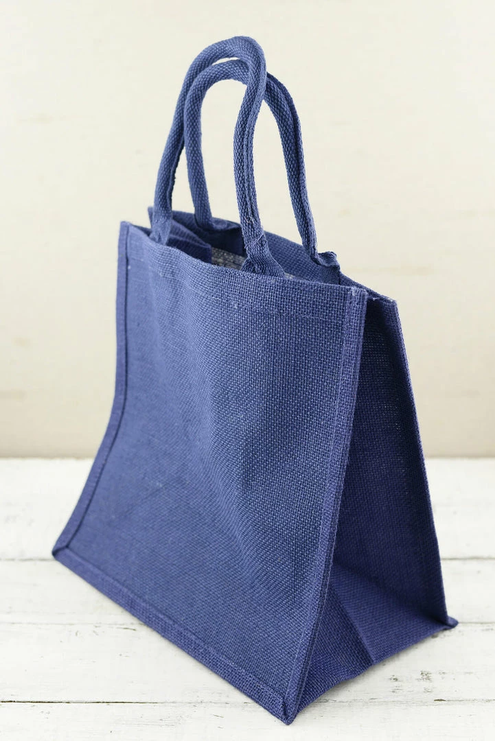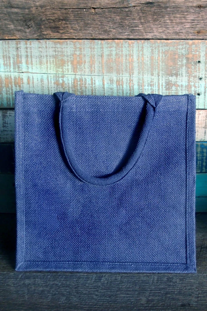 This Blue Burlap Euro Tote Bag is 12″ x 12″ x 7.75″ with padded cotton handles. Natural burlap. The perfect size bag to use as a welcome bag for your guests. Great for party favor bags especially for weddings.
