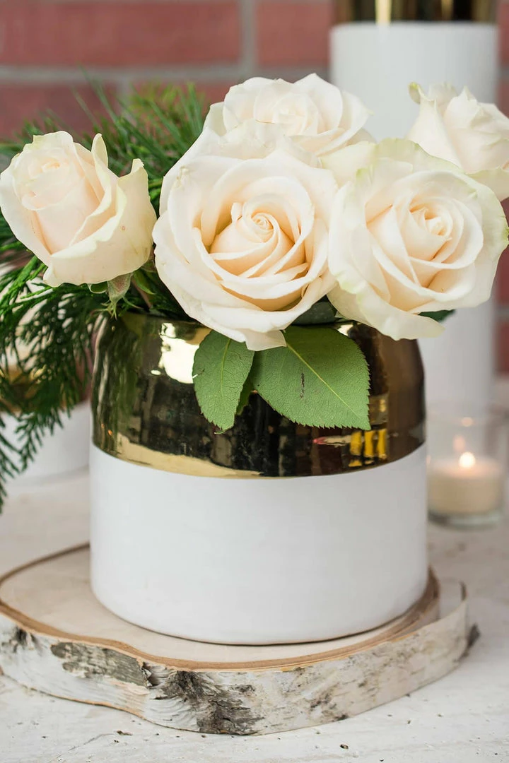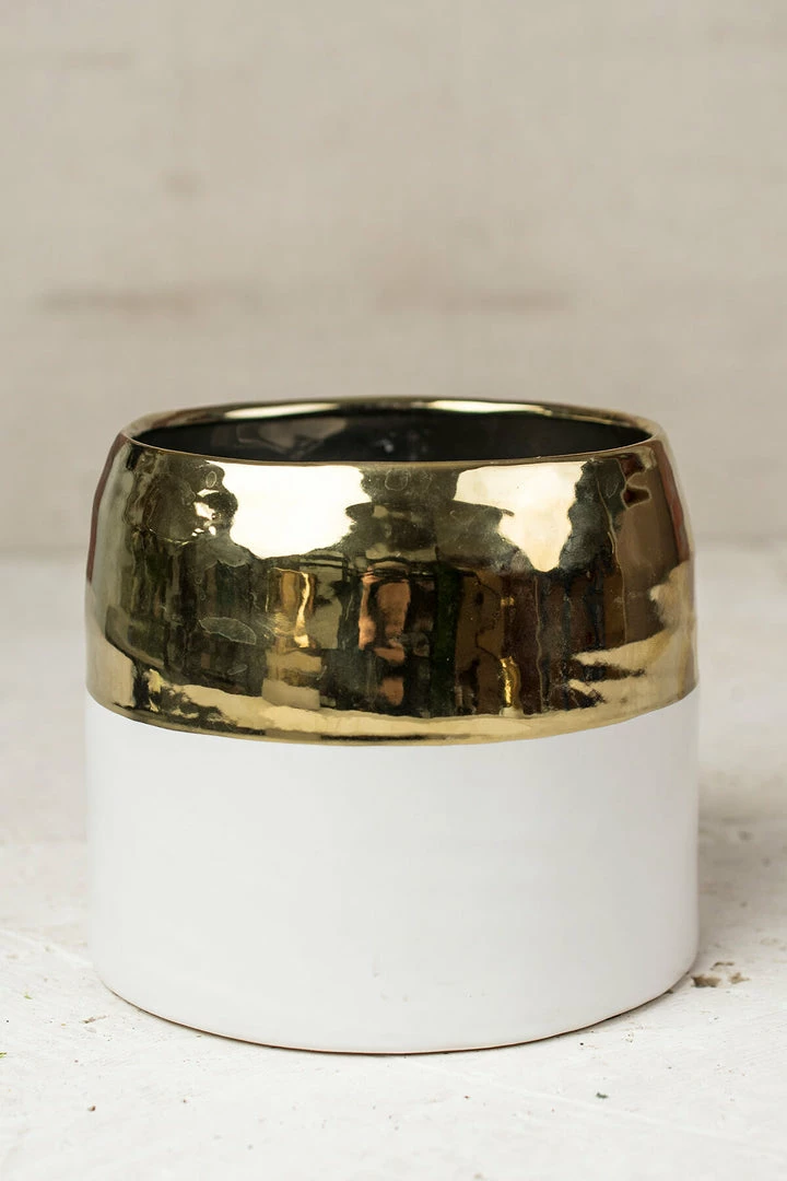 The White and Gold Ceramic Claire Vase & Pot is a contemporary-inspired piece that gives your plants or floral arrangement a modern style home! It features an elegant shape, white glaze, and reflective gold trim. Add a simple floral accent or candle for a welcome table, or fill it with greenery to decorate an outdoor event – perfect for weddings, churches, restaurants, and corporate parties!Â