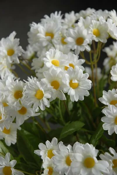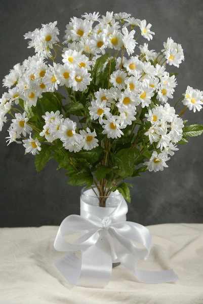 Whether they are sprucing up your dining room, or accenting your outdoor wedding reception, this White Silk Daisy Bouquet will add to a cheerful environment! The stems are wired; and the leaves and flowers are composed of poly silks. Just place inside a vase (not included) for an instant, effortless display.Â