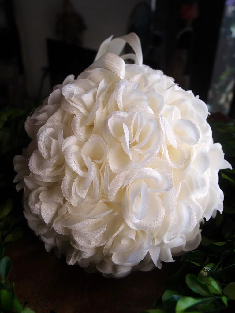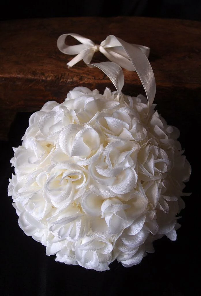 White Rose 6″ Pomander Kissing Ball with satin ribbon hanger. Use for a bouquet, aisle decorations or decor. Individual roses are 1″ wide. The satin ribbon loop is .5″ wide, and tied in a 4.5″ bow.