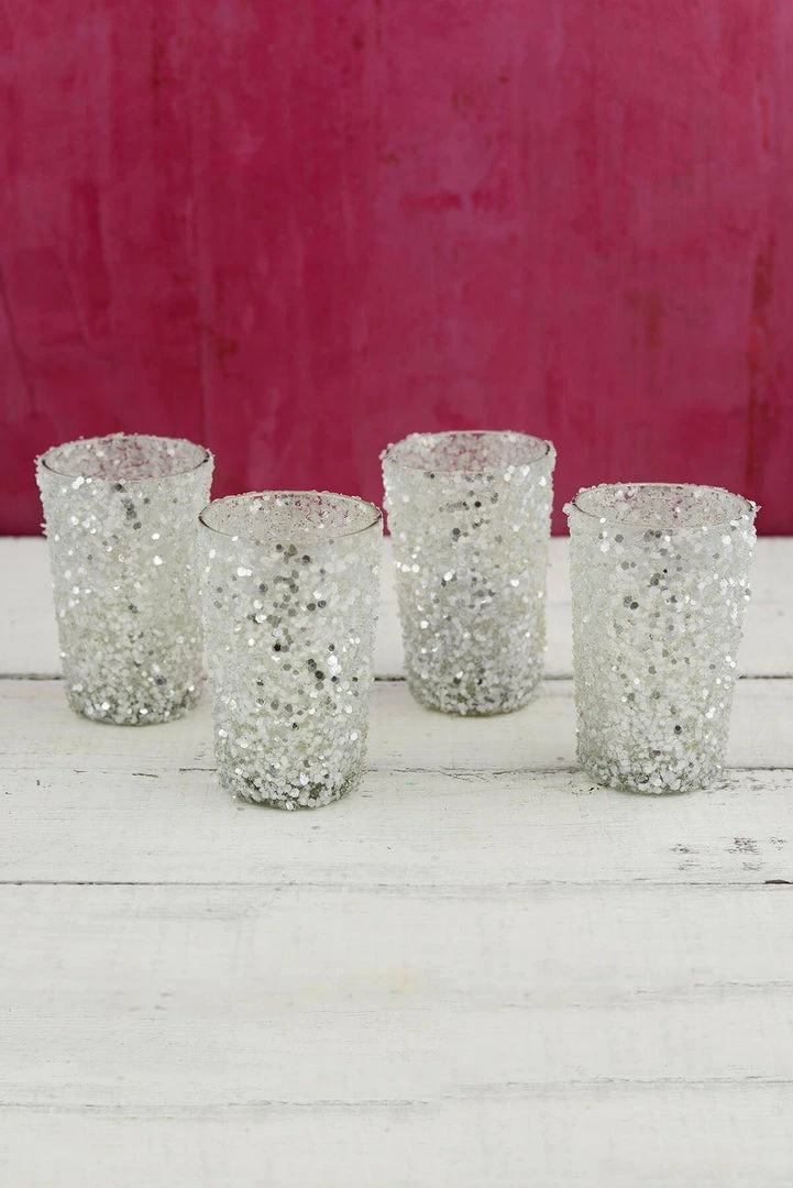 If you love sparkle, you will love the  Sequin Votive Holders in Silver ! These glittered cups come as a pack of four. Pair these votive holders with other metallic items to create glimmering centerpieces for an event; or use them on their own to create a stunning linear display along your dining room table. These glass candle holders are covered with large, reflective silver sequins and are sprinkled with clear beads for added texture.Â