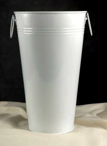 This 11 inch tall x 6.5 inch wide white French flower market bucket has two handles. Comes with plastic liner. With its striking tint, the White Flower Market Bucket compliments your flowers.