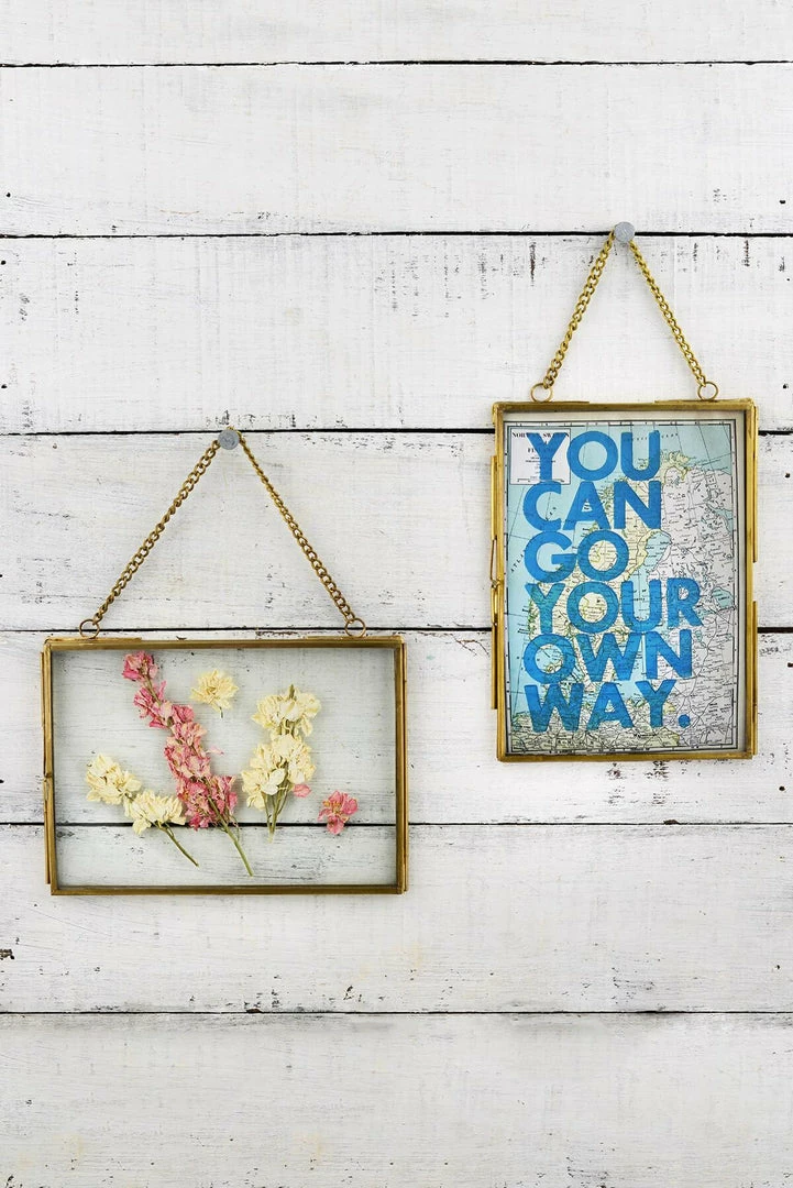 The tasteful construction and vintage style of these Hanging Double Glass Picture Frames makes them perfect for displaying old photos or family documents. The vintage style picture frames measure 5″ by 7″ and are made of brass. One of the floating frames hangs horizontally while the other hangs vertically using the attached chain.