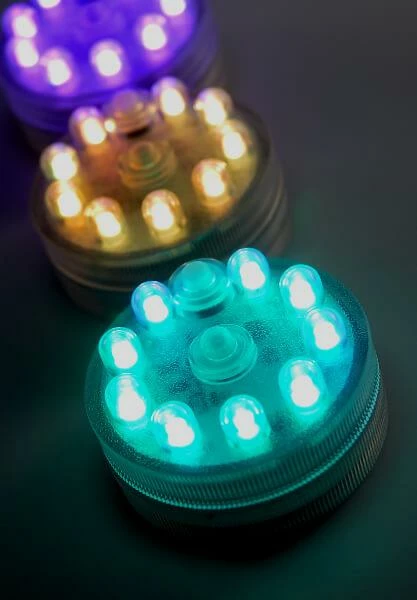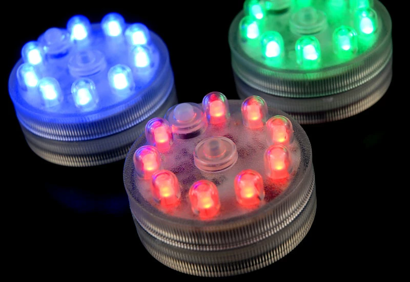 These Acolyte Submersible Sumix9 lights are wireless, miniature, reusable, self-powered lighting units which will illuminate any design application including floral arrangements, design props, table settings, and ice sculptures. Sold as a pack of three. Each of the three has Nine Super bright Multi Color LED Lights. The manual operation allows 6 different color options and 2 RGB color changing functions. This item is compatible with the Acolyte Point-n-Party series remote control (sold separately).Â