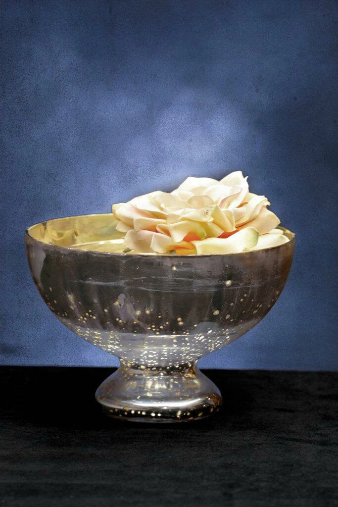 With its smooth exterior and graceful shaping, this Bowl Glass Pedestal Silver Mercury is an impressive choice for your home décor or special event. The raised bowl has a speckled rose gold colored interior, allowing light to seep through the outside. Its silver mirrored outer finish exudes vintage opulence and is perfect for displaying floral centerpieces or using as an accent piece on a banquet table. Fill it with water and use it to hold floating flowers or candles.