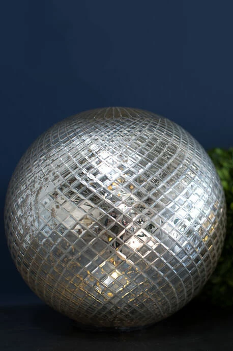 This 10″ wide mercury glass etched LED sphere has warm white lights. It rests on a rubber foam base. And is powered by 3 AAA batteries/ not included. Make a statement at your next event with this wonderful mirror sphere as a centerpiece.