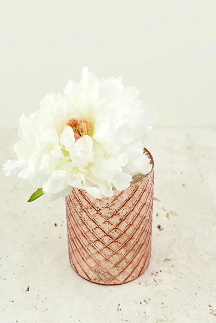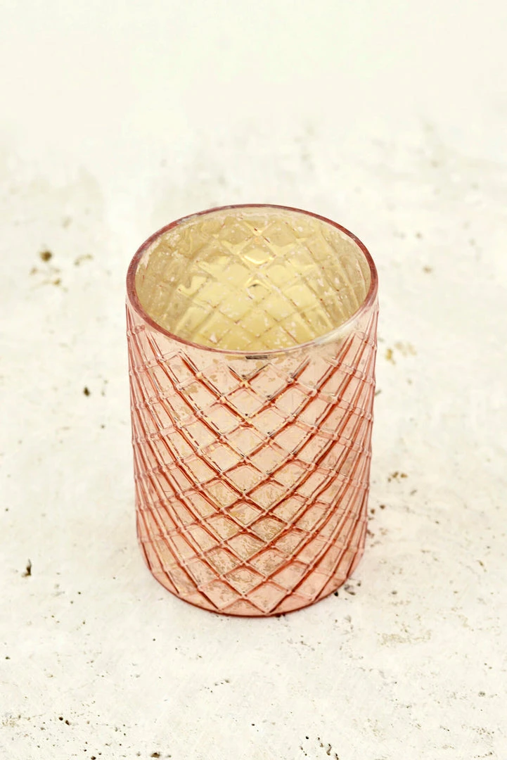 Adorn your tables with these Blush Rose Mercury Glass Votive Holders! Their glittering, rosy-golden bodies and subtle detailing make these 4.5″ candle holders perfect for accenting reception tables. Could also use for small vases. The mercury glass votive holders can hold votive candles as well as tealights. Create a simple linear display along a banquet table. Measures 3″ wide x 4″ tall.
