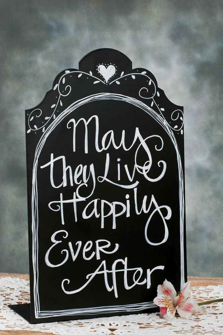 The Standing Chalkboard is the perfect piece for displaying a welcome sign or message at your special event. Place this 14″ sign on a buffet table and use it as a menu by writing on it with chalk markers. Made entirely of metal, this sturdy sign has a painted, matte black finish with a smooth surface. Measures 14″ tall x 9″ wide. Has a small hole in the base plate to screw or nail to surfaces, if desired. Chalkboard surface is magnetic. Best to use chalk markers on it.