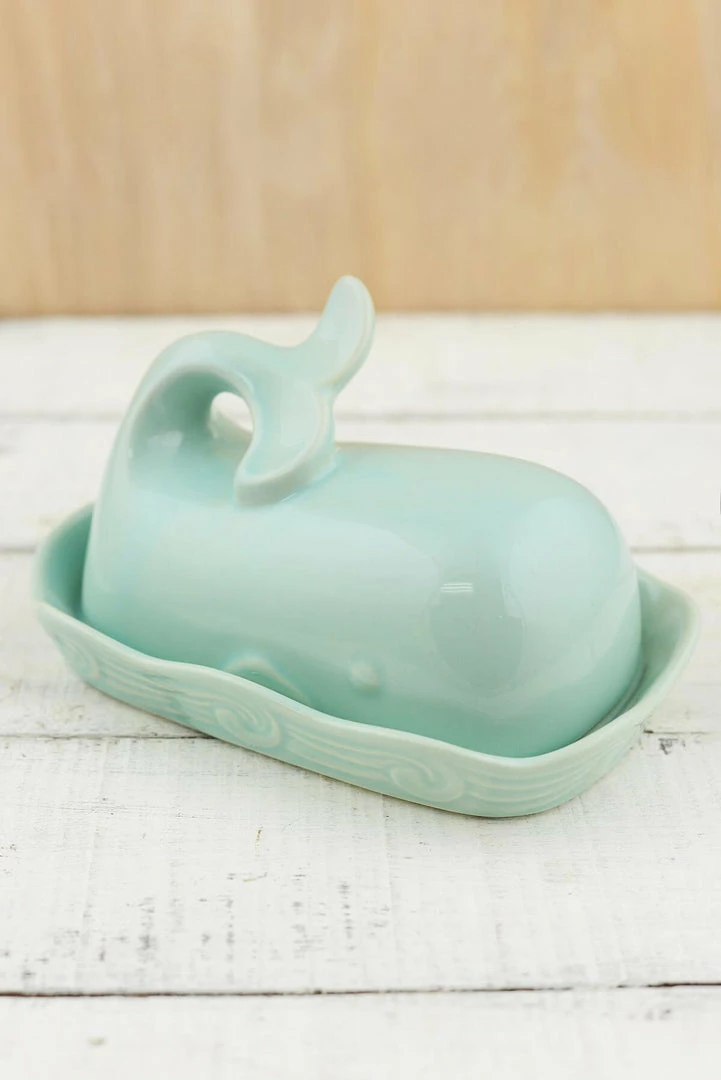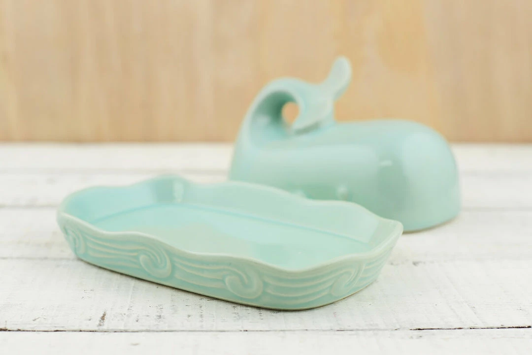Decorate your kitchen with this adorable Whale Butter Dish. The light blue accessory is made entirely from stoneware and comes in two pieces. The bottom is made to look like a delicate wave while the top is shaped like a whale with a gracefully arching tail that makes it easy to lift and access your favorite butter or spread. The beach themed butter dish measures 7.2″ long by 4.7″ wide and stands 4″ tall. This hearty piece makes a lovely addition to your coastal inspired home and is also a great gift for friends and family.