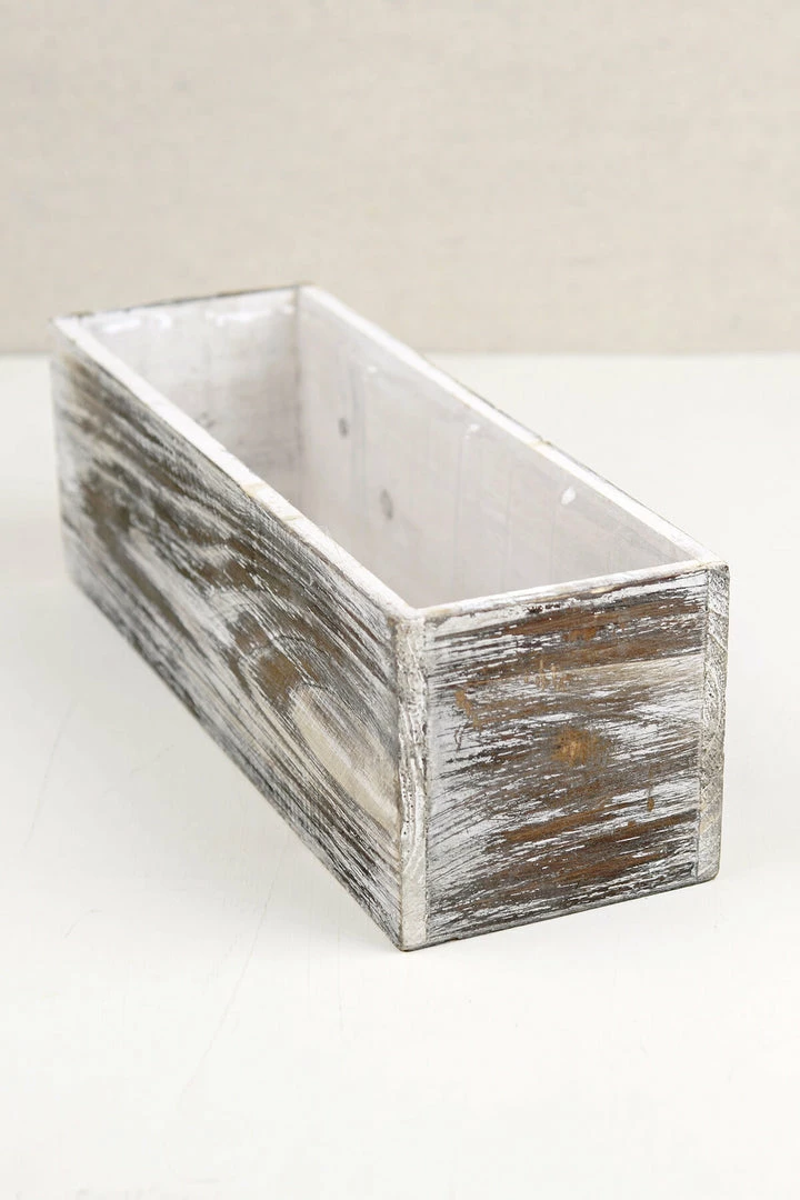 Decorate your banquet tables with this 4x4x12 White Washed Wood Planter Box. This rectangular box will beautifully display floral arrangements at your rustic wedding, or succulents at a southwest-style event. Comes with a plastic liner. Measures 4″ tall x 4″ wide x 12″ long.