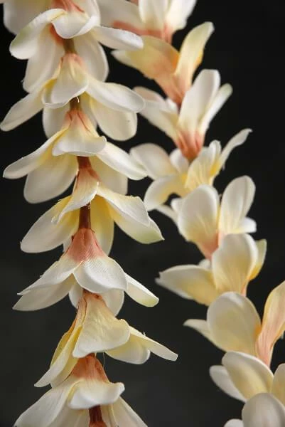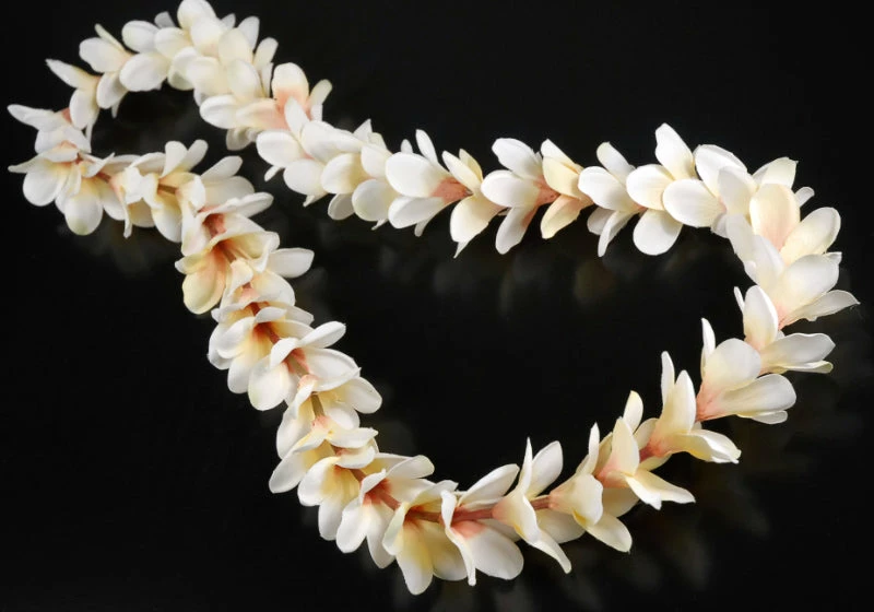 Add an exotic element to your party decor with this florid strand. The Cream Plumeria Silk Lei compliment tropical, beachy weddings or parties. The lovely plumeria flowers have cream and pink-tipped silk petals that keep their vibrancy through every season. For a creative embellishment, cut this lei to create a garland for the backs of chairs at your wedding ceremony. This piece measures 42in long when cut, and 21in long when attached.