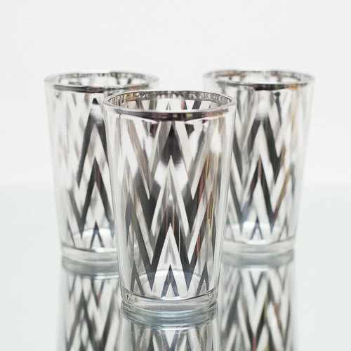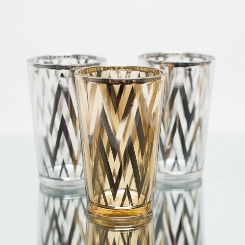 Metallics are in! Our fabulous line of silver, gold, and rose gold metallic glass holders will make your home or event a little more magical. This tall and narrow holder features quality glass, a silver metallic chevron design, and elegant tapered shape. Add our Richland Votive or Tealight Candle options to complete your look (candles not included). Candlelight illuminates the holder, creating enchanting zigs and zags of light, sure to enhance any setting. Not dishwasher or detergent soap safe.Â