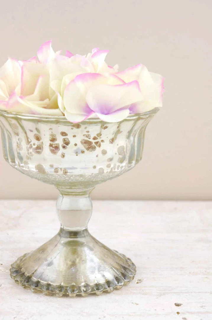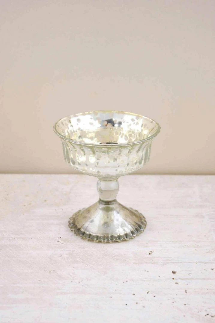 Create charming petite floral arrangements inside this small Silver Mercury Glass Compote. This glass compote features a dappled silver coating which gives it an elegant appearance suitable for use at your vintage wedding, or inside your classically styled home. The silver compote has a slightly ribbed bowl and simple hobnail design at the base of the pedestal to add just the right amount of delicacy in any setting.