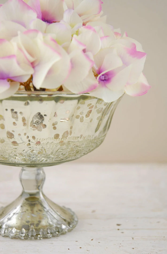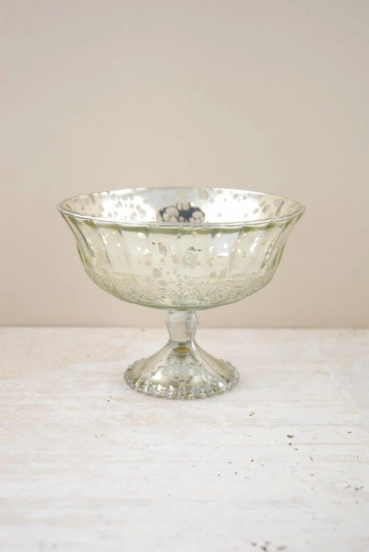 Highlight your sense of style with this Mercury Glass Compote in Silver. This stunning metallic bowl is perfect for adding a little sparkle to any evening event or upscale home décor. It features a slightly scalloped edging, elegant shape and stem, and charming beads of glass on the base. Use this piece to showcase colorful blooms at your wedding or special event, or place it inside a curio cabinet for a fashionable display in any setting. For use with fresh florals, we recommend using floral foam or a pin frog (not included).Â