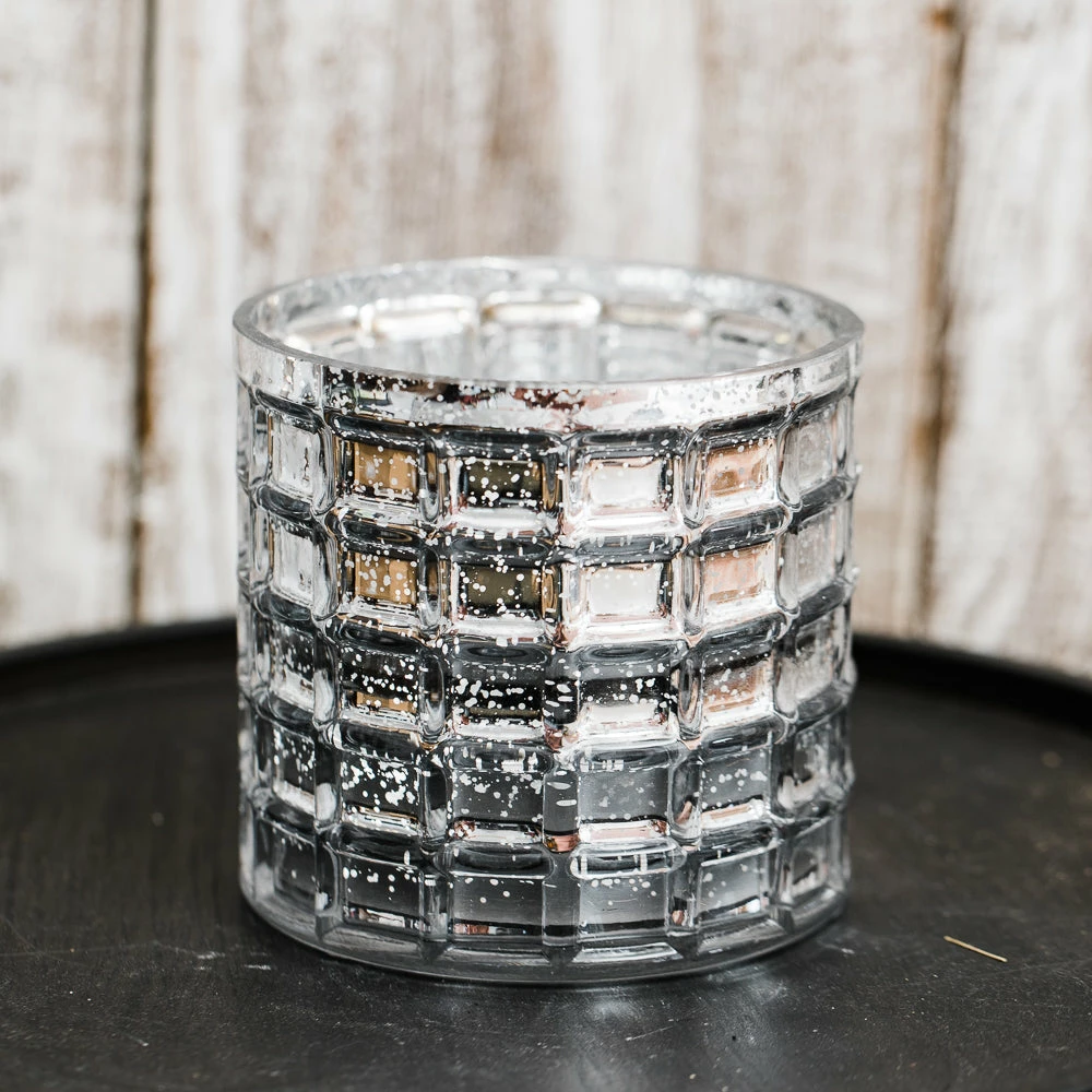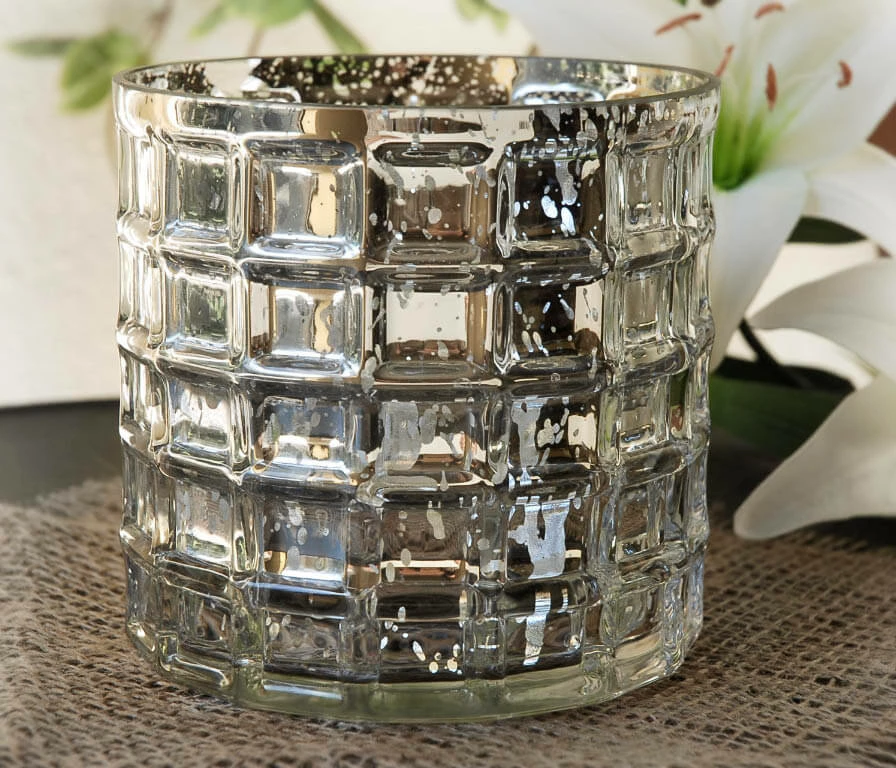 Like the Tower of Babylon, the Silver Mercury Glass Cylinder Vase stands proudly in its environment. Fill this cylinder of mirrored mosaics with thick, floral bouquets. Or, place a candle inside this vase and watch as its icy glow light up its surroundings. This piece is 4.75″ tall, 5″ wide, and contains absolutely no mercury.