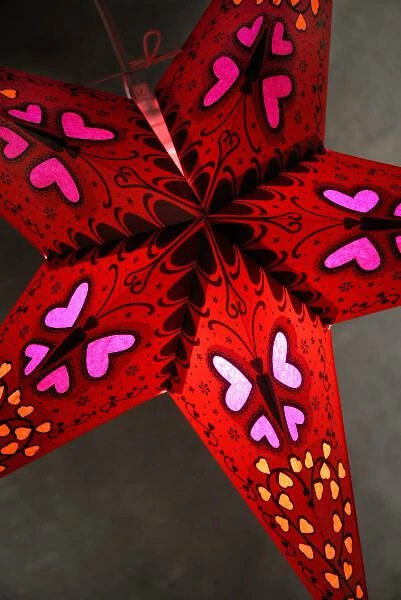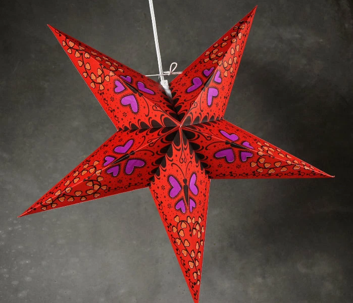 Bring sultry illumination your home with this animated piece. The Red Star Lantern is made with thick cardboard, and features heart-shaped cutout. The cutouts are covered with pink tissue. This piece, once assembled, is 24′ wide, 24′ tall, and has 5 points. It comes flat and requires minimal assembly.