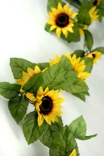 Bring a burst of summery detail to your home or party with this blossoming strand. The Silk Sunflower Garland adds vivid color to its surroundings and will compliment cheerful decor. This garland is 6ft long x 7in wide. The center vine is wired. Individual flowers range from 2.5in to 4.5in wide.