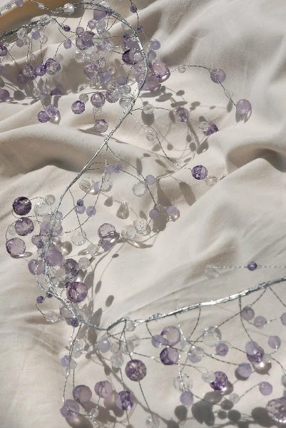 Garnish your event with organic-feeling sparkle with a touch of lavender. The Crystal Garland embellishes your decorated table with icy appeal, and sparkles luminously when it catches light. This strand features purple-tinted clear droplets, and frosted beads, giving it a spring-like energy. This garland is 4ft long, and is composed of multi-shaped acrylic crystals on smaller off shooting wires.