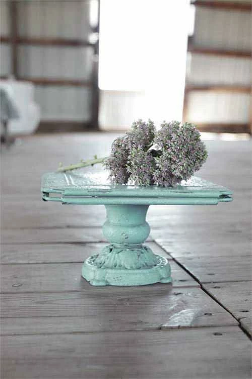 Turn of The Century Decorative Metal Pedestal. What a shabby chic find! With its vintage, distressed look in robin’s egg turquoise, this sturdy display stand could be used for flowers, candles, or desserts. It has a very sturdy base design and is 10-3/4″ square top. Perfect for a rustic or vintage wedding cake display. Or use as a centerpiece and top off with vases filled with flowers. Measures a 10.75″ square and 6-3/8″ tall.