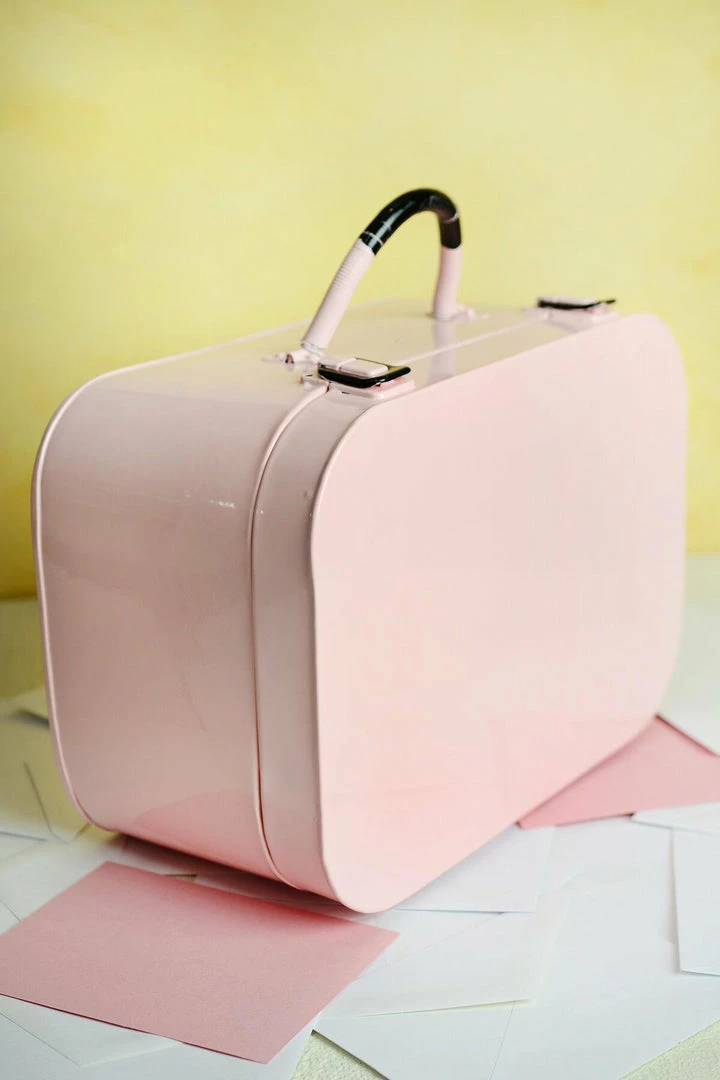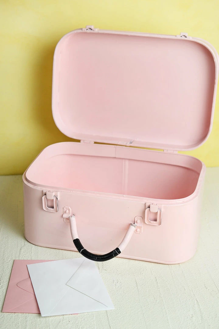 This vintage-inspired pink enamel train case is the perfect accent piece! Sized perfectly for use as a wedding card or bridal shower card holder. This precious piece has a handle and two latches. Measures 5.75″ x 8-3/8″ x 12.25″ (not including the handle or latches). Place on the greeting table for your event; or even use as an accessory case for a child’s bedroom. Adorable! Decorative use only.Â