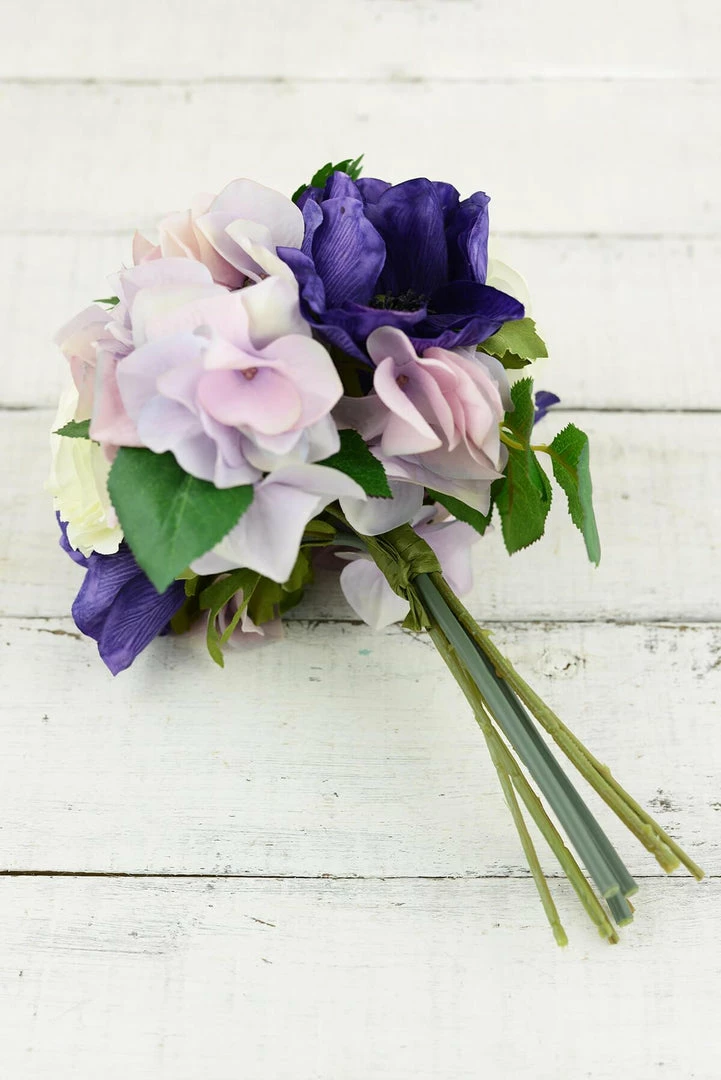 Nothing can compare to ranunculus, hydrangeas and anemones for a springtime bouquet. With its delicate coloring, this bouquet is filled with cream, light pink, and dark purple flowers with sprigs of greenery interspersed between the blossoms. The bouquet measures 10″ tall and measures about 6″ wide. Filled with hydrangea, ranunculus, and anemone silk flowers.