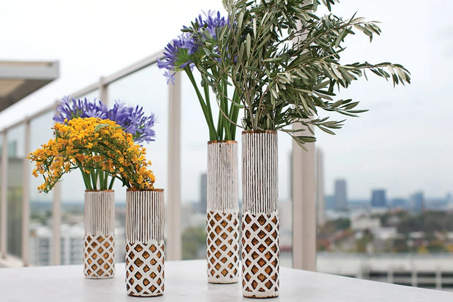 This chic ceramic Boho Vase in Copper & White is perfect for creating striking centerpiece arrangements at a modern wedding or bohemian inspired event. Place a single anemone inside this textured vase to complement a modern tablescape; or fill it with a lush, jewel-toned bouquet for an upscale garden party. This eclectic cylinder vase features a white lattice pattern on the bottom that changes to a striped pattern on the top half. The glass has a warm, bronze tone and a discreet mercury glass texture on the inside.Â