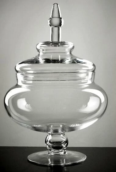 Fill this charming clear Glass Apothecary Jar 14″ with candy or sweet treats at the favor station of your wedding reception or birthday party. Or, use the apothecary jar as an attractive storage container for your bathroom essentials such as cotton balls and small soaps. The small pedestal and unique bell-shaped lid of this piece creates instant elegance in any setting.Â