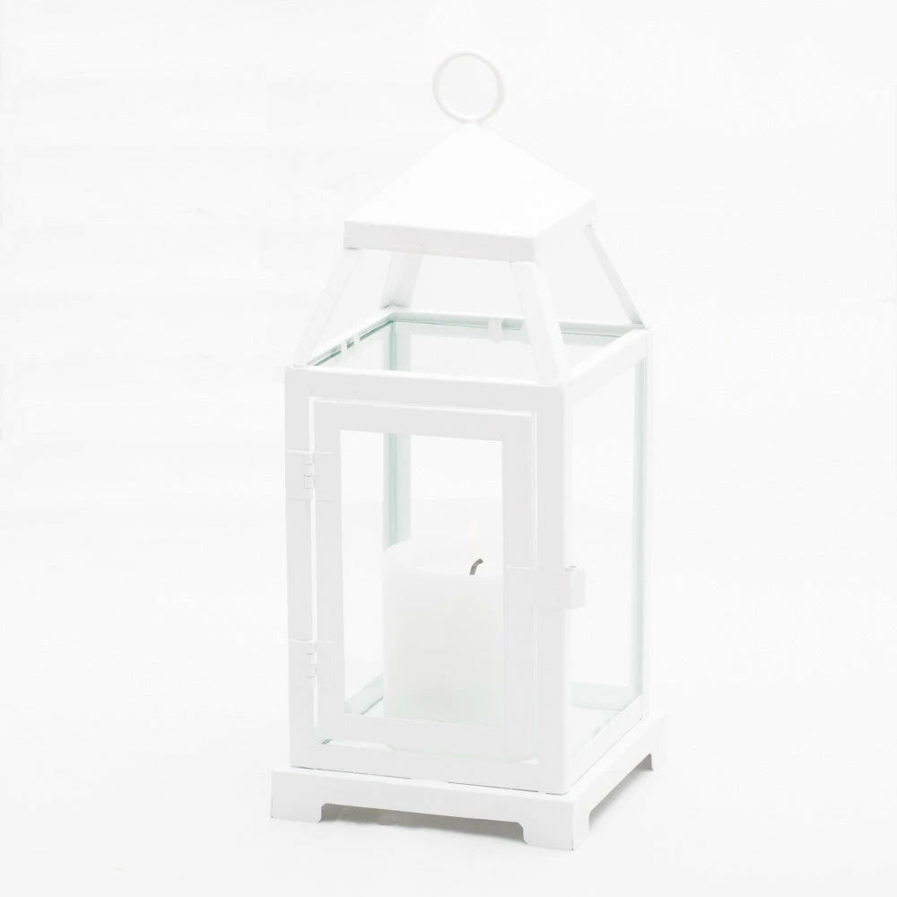 Wonderfully White! This small peaked contemporary metal lantern with white finish is such a great size and fit for most any occasion! The sturdy base and easy to use metal latched door lend to the security of the flame inside! The four sides come complete with glass and the hitched peak has open space for the heat of the flame to escape. With the small addition of the circle atop the peak, this lantern can also easily be a hanging lantern as well.