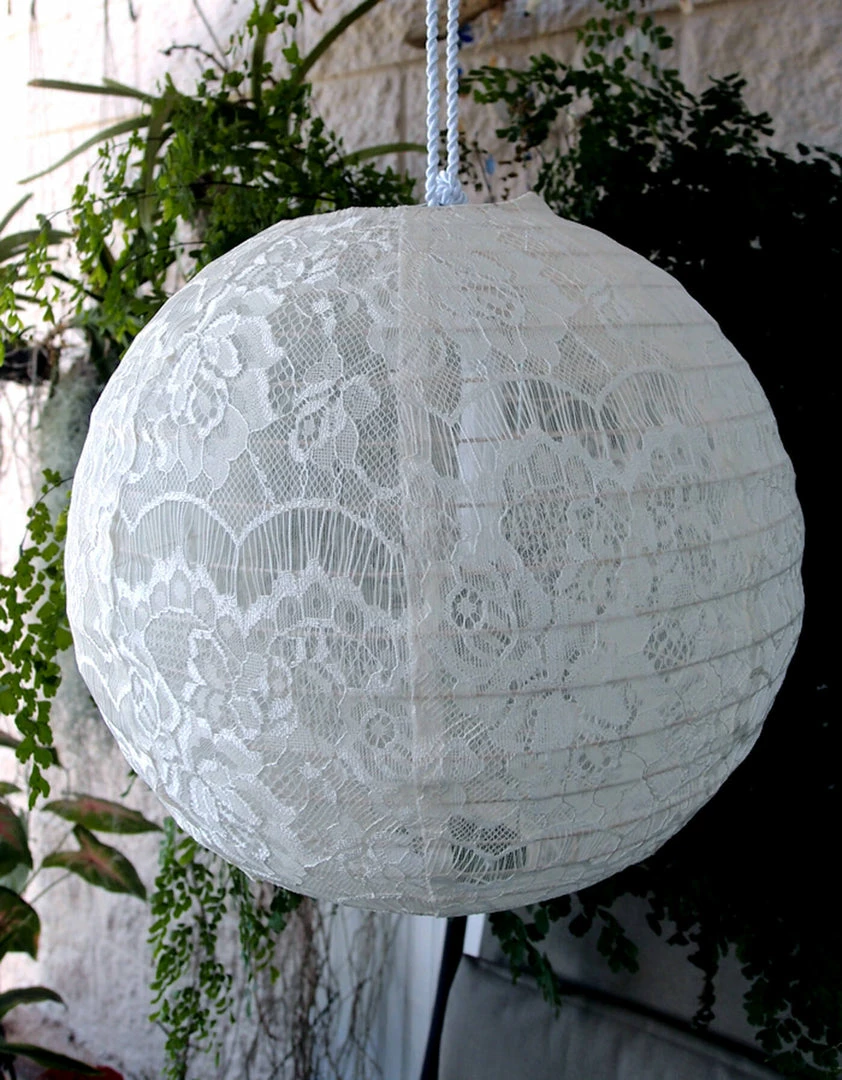 The perfect wedding lantern. This is a 12″ wide lantern made with lace fabric. A pretty white lace lantern that will add a stunning look to your wedding decorations. Just add lighting to create a magnificent light that will make your event or wedding reception something to remember!