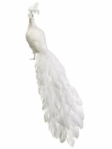 This regal artificial bird is covered with white natural feathers over a lightweight plastic inner body; and has wired feet. It has a closed tail that measures about 19in long with natural white feathers. Stands 9in tall on wired legs. The peacock body is 9in long 9in long and 3.5″Â wide at the chest. Total length of approximately 27in.Â