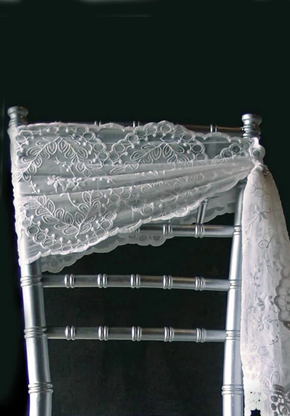 Add the soft elegance and vintage charm to your tables and chairs with this white embroidered lace and tulle runner. The intricate design of this lace and tulle runner includes leaf and floral patterns. 12 inches wide x 74 inches long.