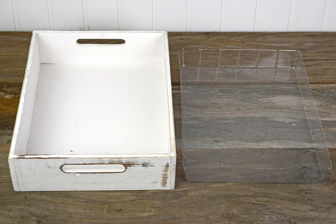 Distressed white painted 10″x14″ wood tray with cutout wood handles on two sides. The sides are 3″ tall. Comes with a plastic liner.