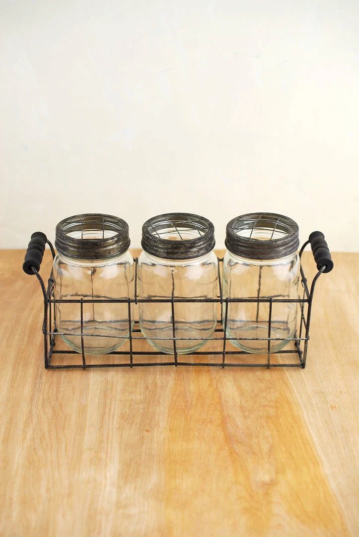 Richland Wire Basket With 3 Glass Mason Jars With Frog Lids