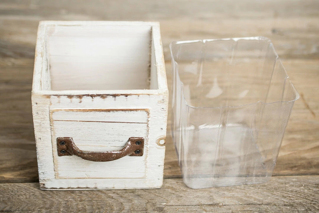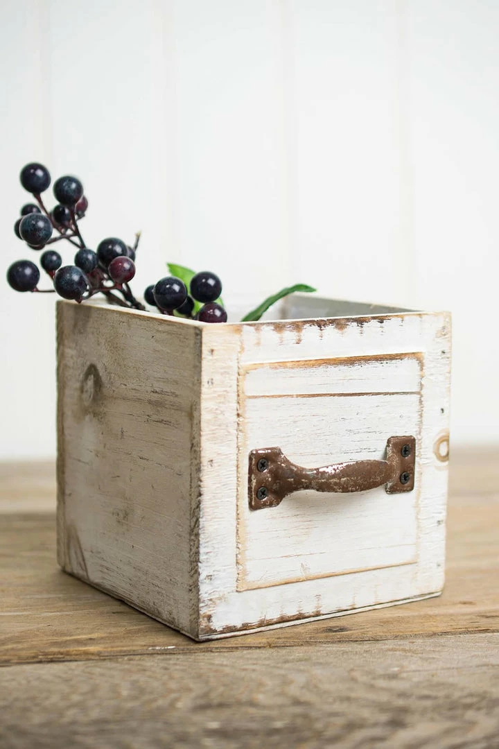 The white washed wood details and weathered metal handles make these planter boxes perfect for rustic and country chic events. Each is fitted with a plastic liner to hold flowers. It is a solid wood box painted white and has a metal drawer pull. It is 4.5 x 4.5 x 4.5″.