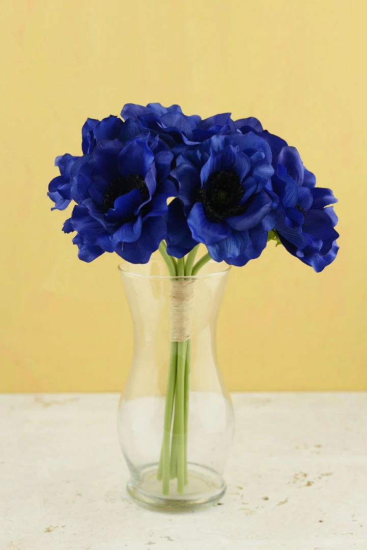 A beautiful blue anemone bouquet. This gorgeous anemone silk flower bundle with its black centers is tied with raffia. Add other flowers and fillers to make into a unique wedding bouquet for decoration or bridesmaids.