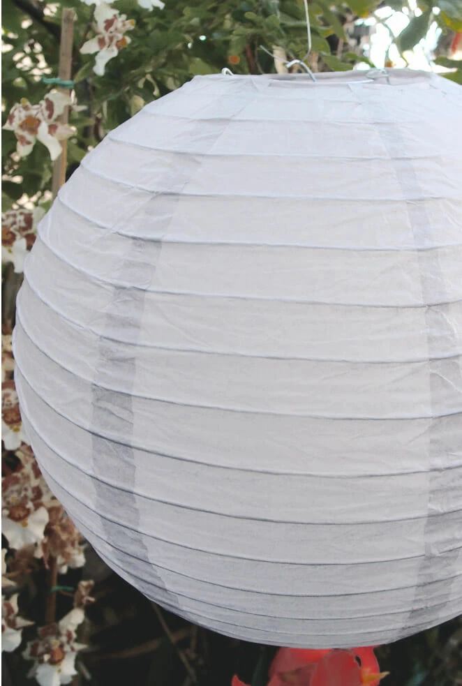 Create whimsy at your event or party with this round 12″ White Paper Lantern. Hang the lantern high and fill with string lights to illuminate or hang from trees for an outdoor gathering. This lantern can also be used as an accent in a serene bedroom or office. Paper Lanterns are an economical way to enhance atmosphere in any setting. Our lanterns are easy to use and can be folded back flat and re-used time and time again! Features wire ribbing and is held open by a wire expander. Comes with a hook for hanging.